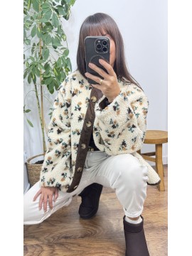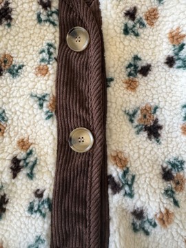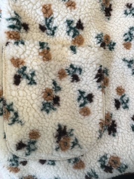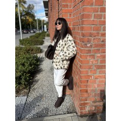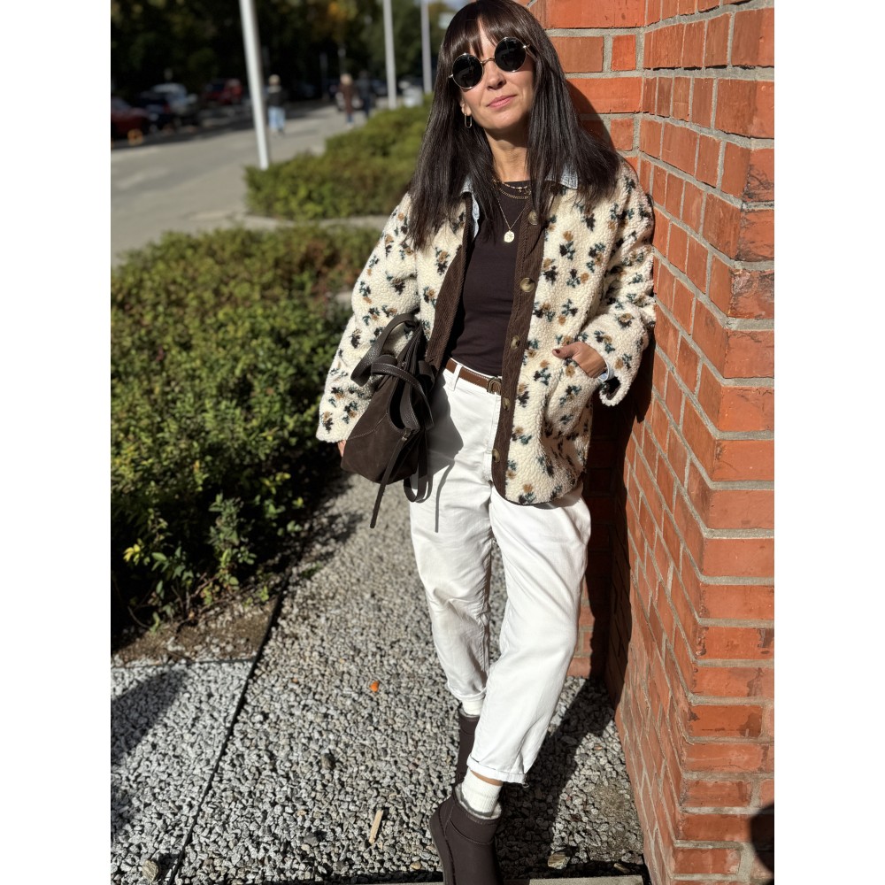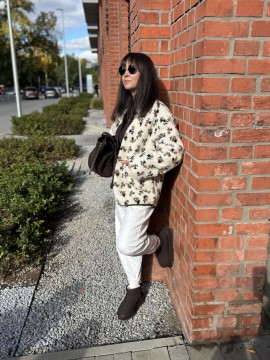 Oversize’owa kurtka z polaru. Cieplutkie okrycie wierzchnie przypadnie do gustu fankom nieco ekstrawaganckich, dziewczęcych designów. Doskonale sprawdzi się podczas chłodniejszych dni ze względu na ciepły materiał. Kurtkę damską noś razem z sukienkami czy T-shirtami i spodniami. Zapinana na guziki ,okrągły dekolt.