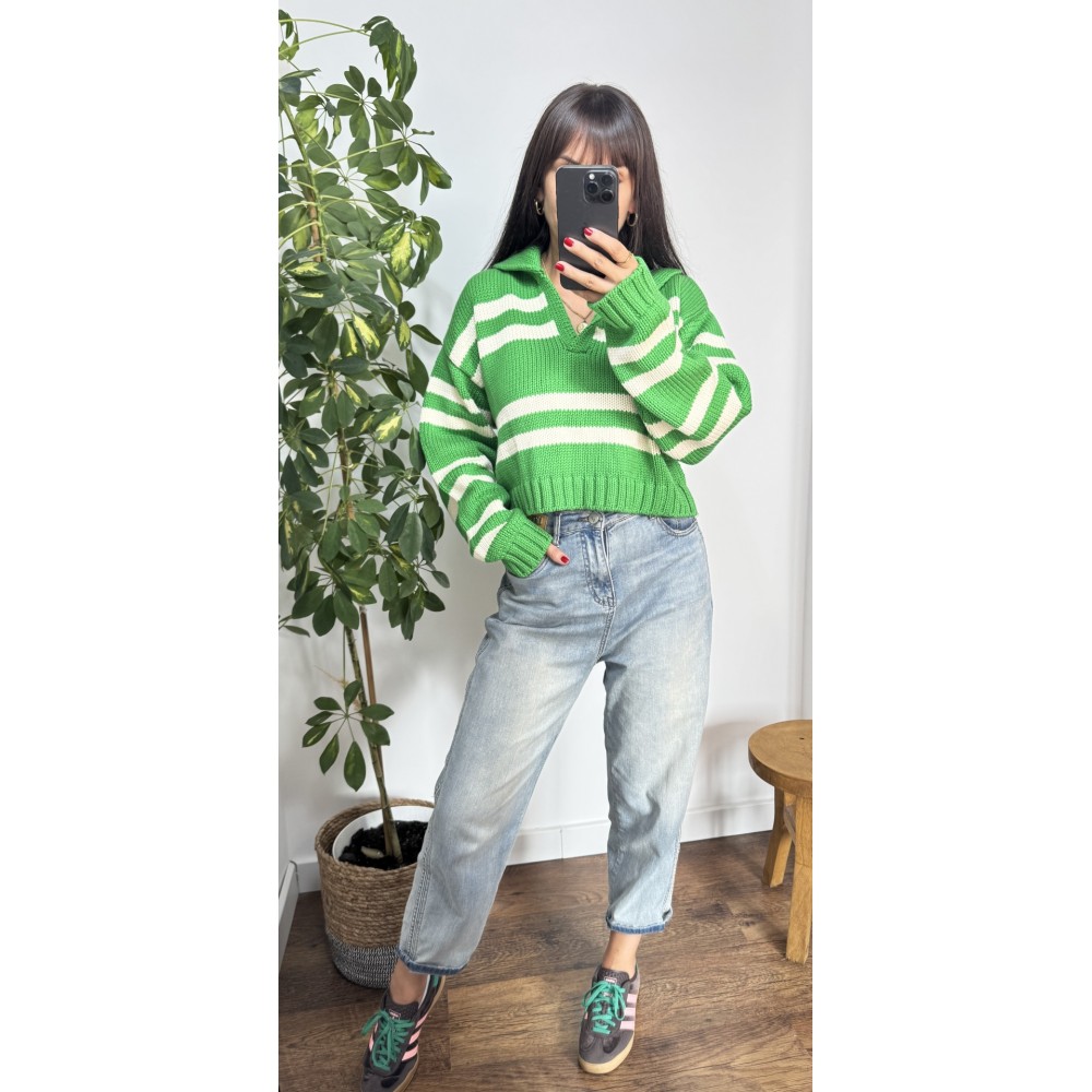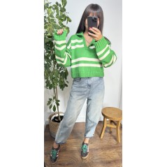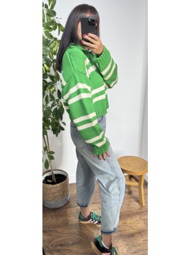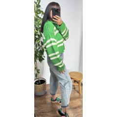 Sweter POLO - kolor zielony w białe paski . Krój oversize z dekoltem w serek oraz kolnierzykiem.