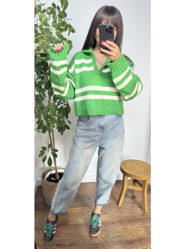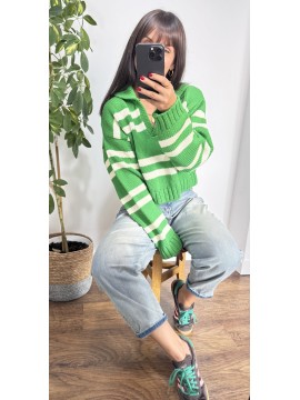 Sweter POLO - kolor zielony w białe paski