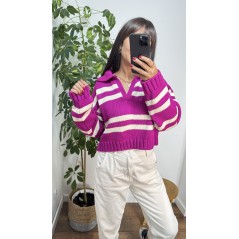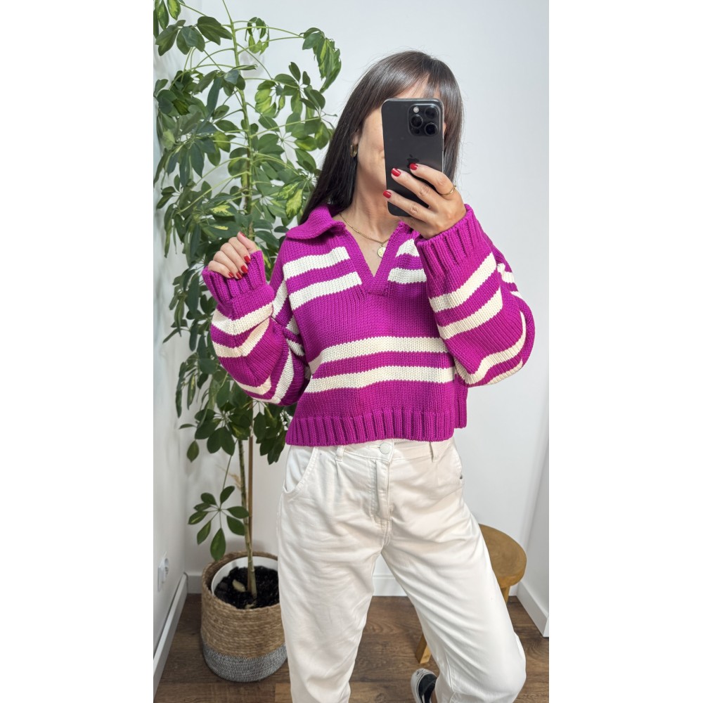 Sweter POLO - kolor amarantowy w białe paski . Krój oversize z dekoltem w serek oraz kolnierzykiem.