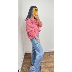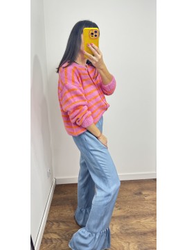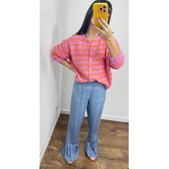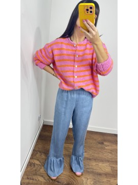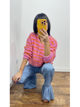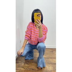 Sweter MILO kolor różowy w pomarańczowe paski- rozpinany na guziki