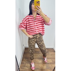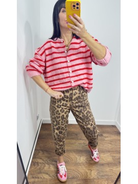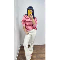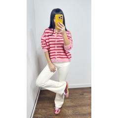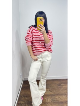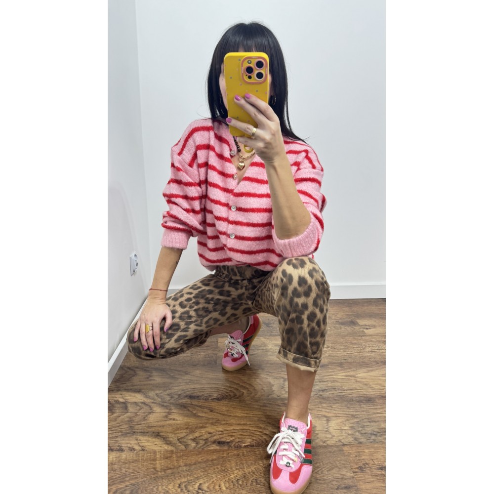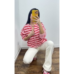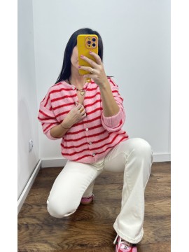 Sweter MILO kolor różowy w czerwone paski- rozpinany na guziki
